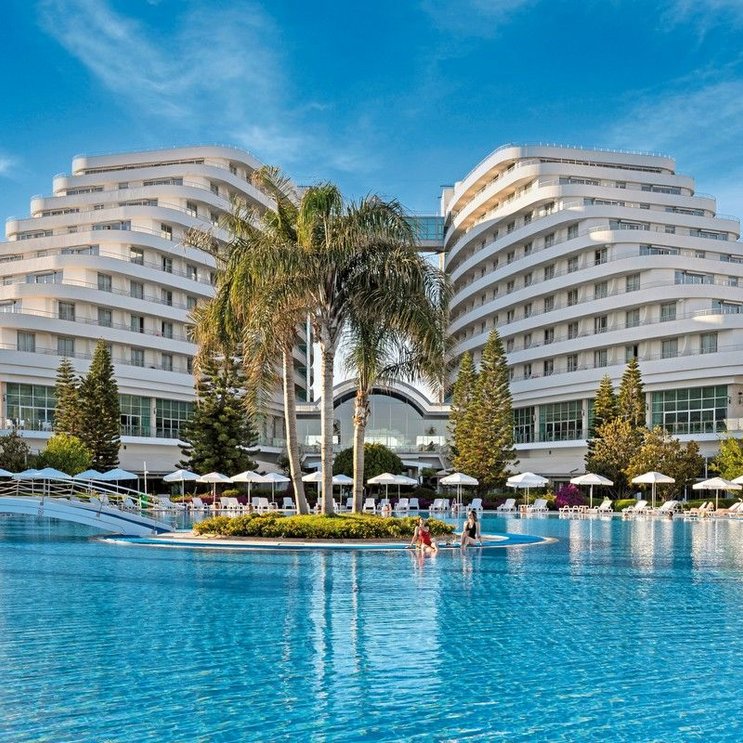 Eine imposante Erscheinung am Lara-Strand sind die zwei weißen Gebäude in V-Form. Genießen Sie den Alles-inklusive-Verwöhnservice und das große Sport-, Wassersport- und Spaßprogramm!