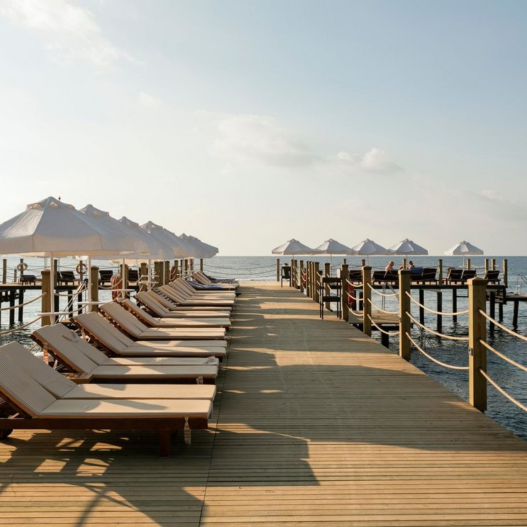 - Kiesstrand: leicht abfallend, gehört zur Anlage, ca. 180 m lang, Sonnenschirme, Liegen, Cabaña (kostenpflichtig), Strandtuch/Badetuch, Badesteg (Liegen, Schirme)