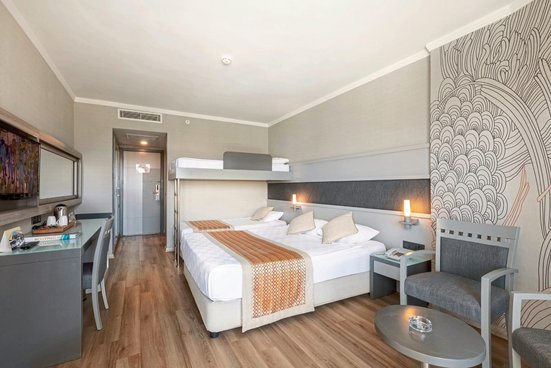 - 26-30 qm, Familien, mit Verbindungstür, Hauptgebäude, 2 separate Schlafzimmer, 2 Einzelbetten, Doppelbett, Dusche, WC, Haartrockner, Laminatboden, Klimaanlage, zentral gesteuert, ca. 1.6.-30.9., Minibar, Auffüllung bei Anreise, Softdrinks, Wasser, Safe (kostenpflichtig), 2 TVs (Sat-TV, Flachbildschirm), Wasserkocher, Kaffee/Tee, Balkon