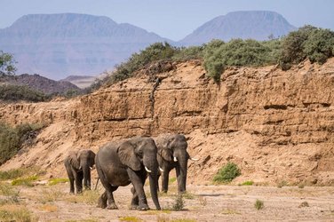 6ᴱ JOUR: Damaraland. Découvrez les diverses facettes du Damaraland. La forêt pétrifiée et les tuyaux d'orgue de dolérite vers Twyfelfontein ne sont pas les seules attractions. A bord d'un véhicule de safari à toit ouvert, vous partirez à la recherche des éléphants du désert. Le fait de pouvoir admirer ces géants gris dans un paysage aride est une expérience inoubliable. Nuitée silver Camp Kipwe ou sim. (PdDS), gold Damaraland Camp ou sim. (PdDS)