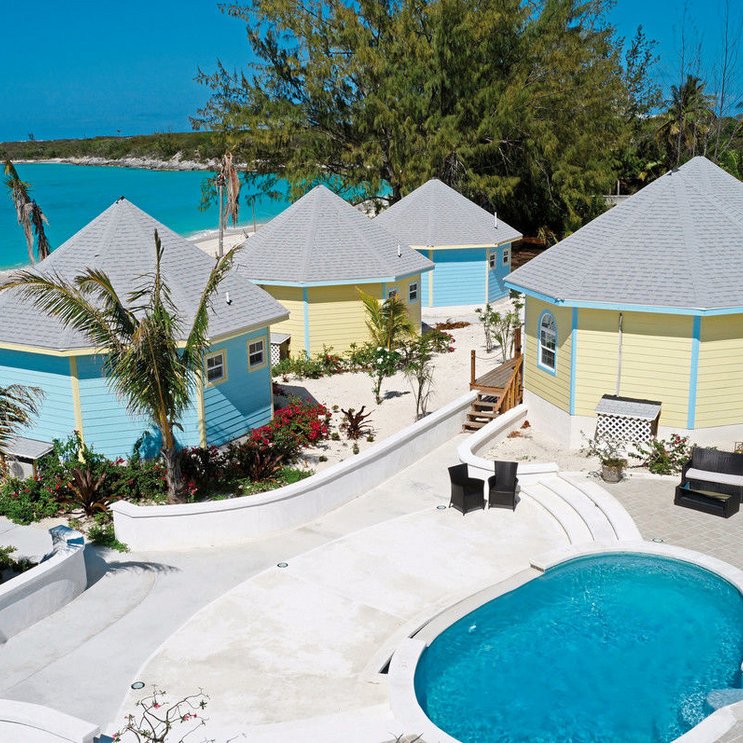 Comme des touches de bleu ciel et de jaune pâle, les jolis bungalows sur le sable blanc ressemblent à un style bahamien. Savourez également une cuisine bahamienne typique au « Franco-Bahamian » !