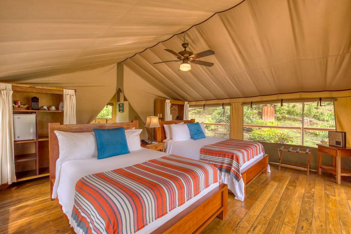 InfrastructureTentes safari de haute qualité, réparties sur la colline. Les tentes sont confortablement équipées et disposent d'une terrasse, d'un lit king-size, d'un petit canapé-lit ainsi que d'un ventilateur de plafond, d'un minibar et d'un coffre-fort. Deux restaurants et une petite piscine complètent l'infrastructure.
