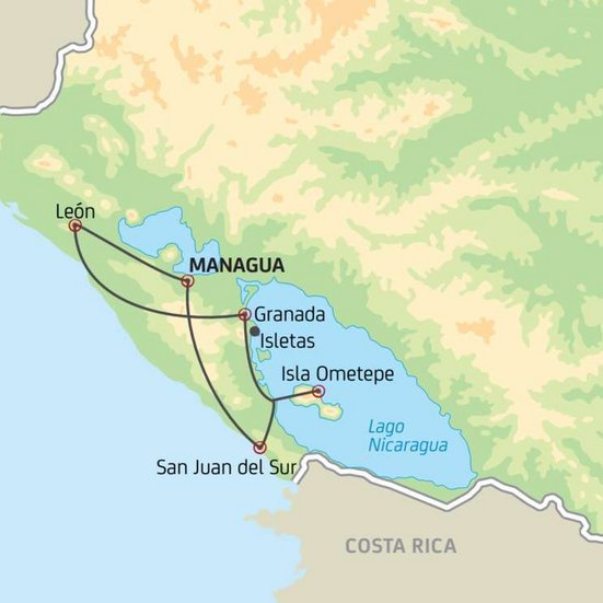 Randonnée dans la réserve naturelle de Charco Verde, située au pied du volcan Concepci6n. Vous vous baladez le long de la lagune Charco Verde et du lac Nicaragua et profitez de la vue sur les volcans Concepción et Maderas. La réserve est également la patrie de nombreux oiseaux et singes hurleurs. Ensuite, vous regagnez la terre ferme et rejoignez San Juan del Sur, un lieu de prédilection pour les surfeurs et baigneurs au bord de l’océan Pacifque.
