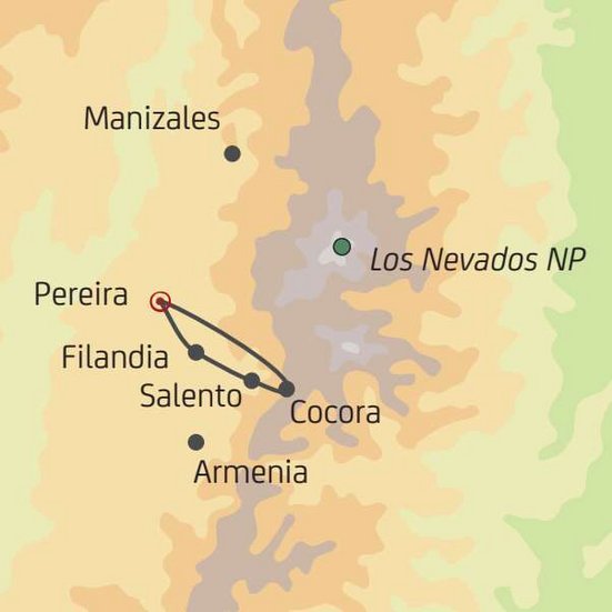 Bienvenue dans la région du café en Colombie ! Dans le « triangle du café » autour des villes de Manizales, Pereira et Armenia, la boisson chaude noire est reine. Arrivée à l’aéroport de Pereira, la capitale de la région de Risaralda, et transfert à votre hôtel où vous passerez les quatre prochaines nuits. Vous serez entouré par le magnifique paysage des plantations de café, un point de départ idéal pour des excursions dans la zone caféière.