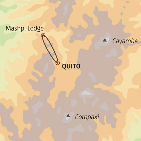 Trajet de trois heures de Quito au nord-ouest de l’Équateur, dans la réserve privée de Mashpi. Le Masphi Lodge est situé à environ 950 m d’altitude, entouré de forêts tropicales et de nuages. On y trouve une grande variété de plantes, des fougères, des broméliacées et des centaines d’orchidées. De plus, la région est un paradis pour les amateurs d’oiseaux, on estime à 400 le nombre d’espèces différentes qui s’y ébattent. Dans la forêt luxuriante vivent également des singes, des pécaris, des fourmiliers et des pumas, qui ne se laissent toutefois voir que très rarement.