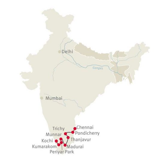Les plus beaux trésors culturels du Tamil Nadu combinés de manière impressionnante avec la beauté naturelle du Kerala. Un voyage varié qui vous emmène de la côte de Coromandel au sud-est à la côte de Malabar au sud-ouest.