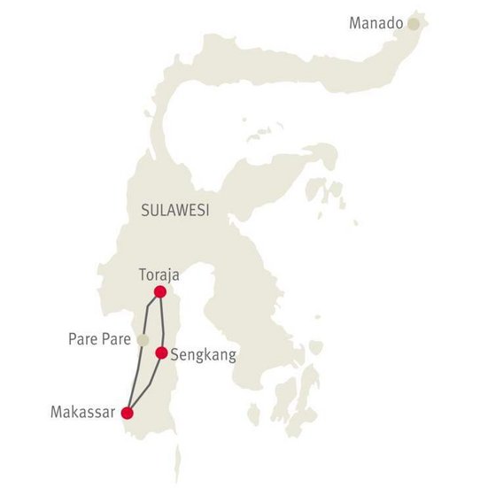 Arrivée à Sulawesi tôt le matin. Trajet d'une journée le long de la côte ouest jusqu'à Pare Pare, où la route mène dans les montagnes. Les villages de pêcheurs des fiers Bugis sur pilotis, les montagnes bleues scintillantes en arrière-fond et les étranges formations rocheuses karstiques dans les rizières d'un vert intense, sont un vrai régal pour les yeux. Arrivée en fin d'après-midi.