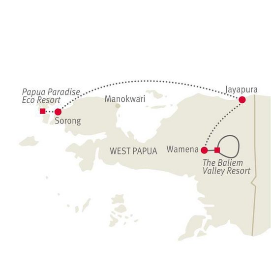 Ce voyage dans un autre temps, dans un autre monde, est une combinaison étonnante avec la visite du peuple des Dani dans la haute vallée de Baliem et la beauté renversante sur et sous la surface de l'eau des îles Raja Ampat.