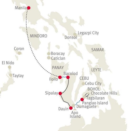 Découvrez pleinement la vie rurale philippine grâce à cet itinéraire passionnant d'île en île à travers la région des Visayas. Le décor se présente tel un jardin d'Eden tropical, sur et sous l'eau!