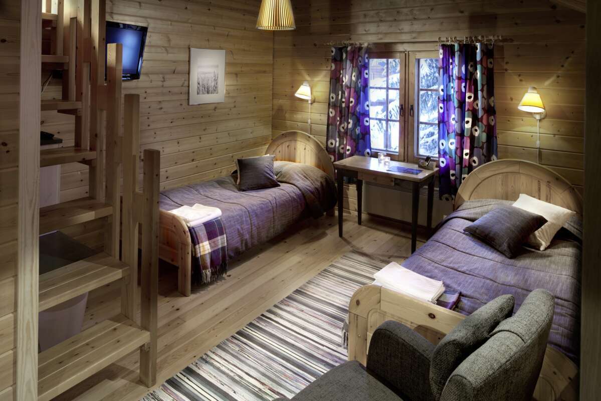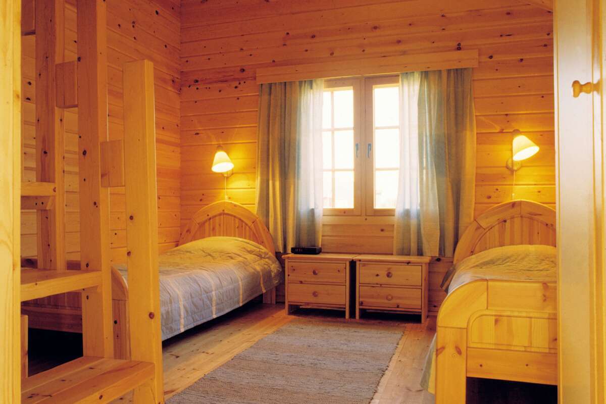 Les 32 chambres confortables et typiques ont deux lits. Chaque chalet est divisé en quatre chambres. Sur la petite mezzanine, il y a parfois de la place pour 2 lits supplémentaires. 8 chambres n'ont pas de mezzanine. Elles sont reliées par un salon commun avec cheminée et disposent en outre de deux saunas communs.