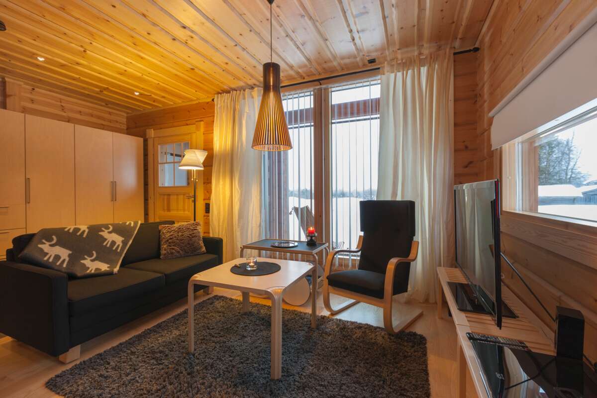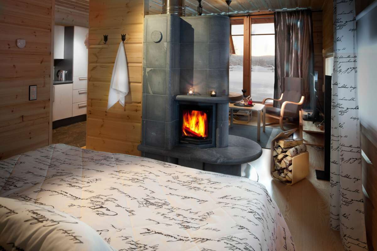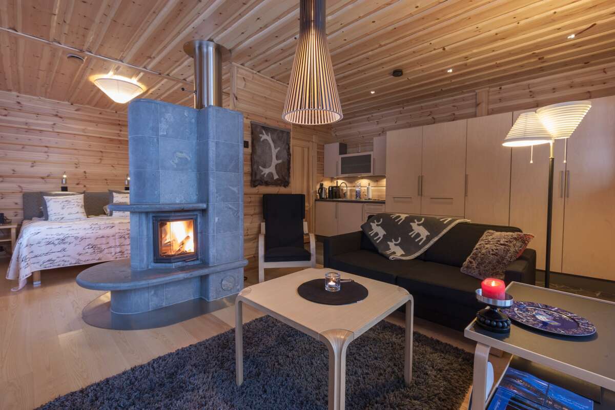 La cheminée, moderne et réalisée à la manière finlandaise traditionnelle, est la pièce maîtresse de ces logements. Le séjour et chambre ouverte (avec lit Kingsize) est divisé grâce à la cheminée. Ainsi vous avez toujours une vue extraordinaire sur le feu rougeoyant. La spacieuse salle de bain avec deux lavabos et une douche en pierre a été conçue avec un soin du détail tout particulier.