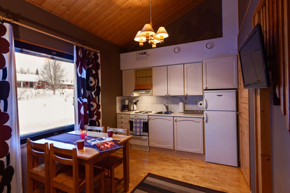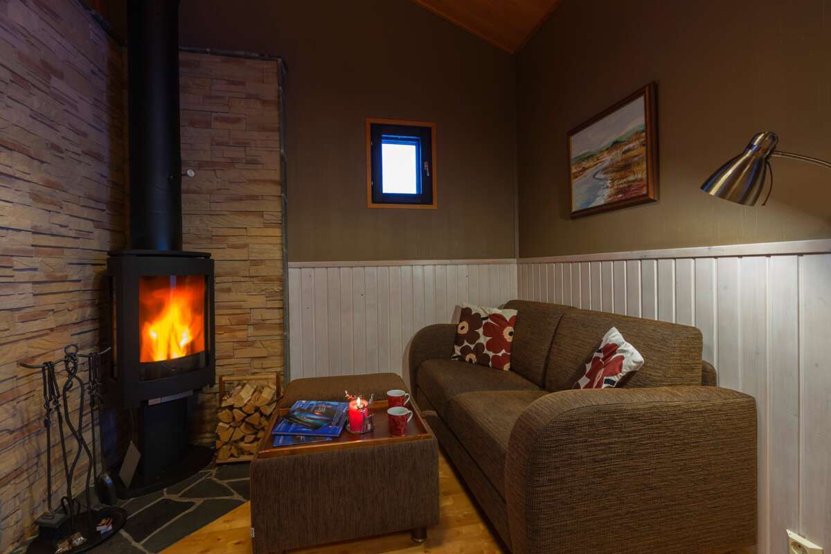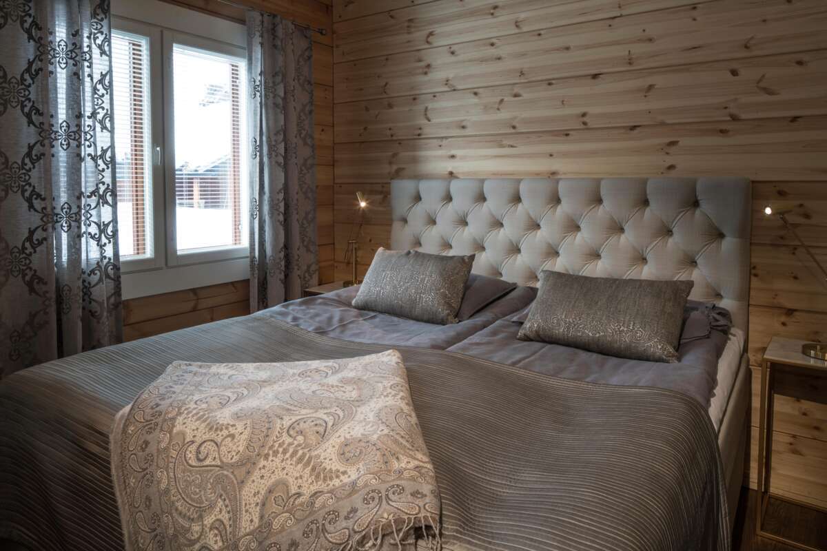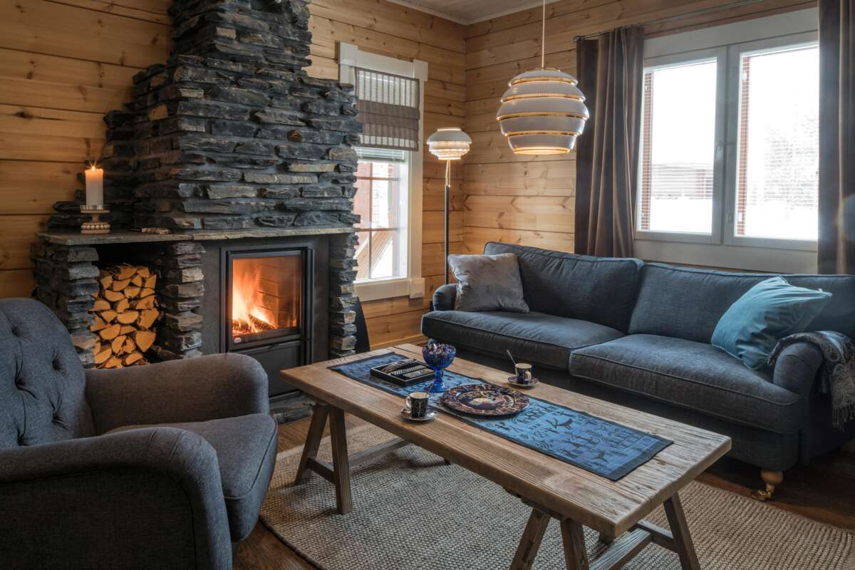 La cheminée, moderne et réalisée à la manière finlandaise traditionnelle, est la pièce maîtresse de ces logements. Le séjour et chambre ouverte (avec lit Kingsize) est divisé grâce à la cheminée. Ainsi vous avez toujours une vue extraordinaire sur le feu rougeoyant. La spacieuse salle de bain avec deux lavabos et une douche en pierre a été conçue avec un soin du détail tout particulier.
