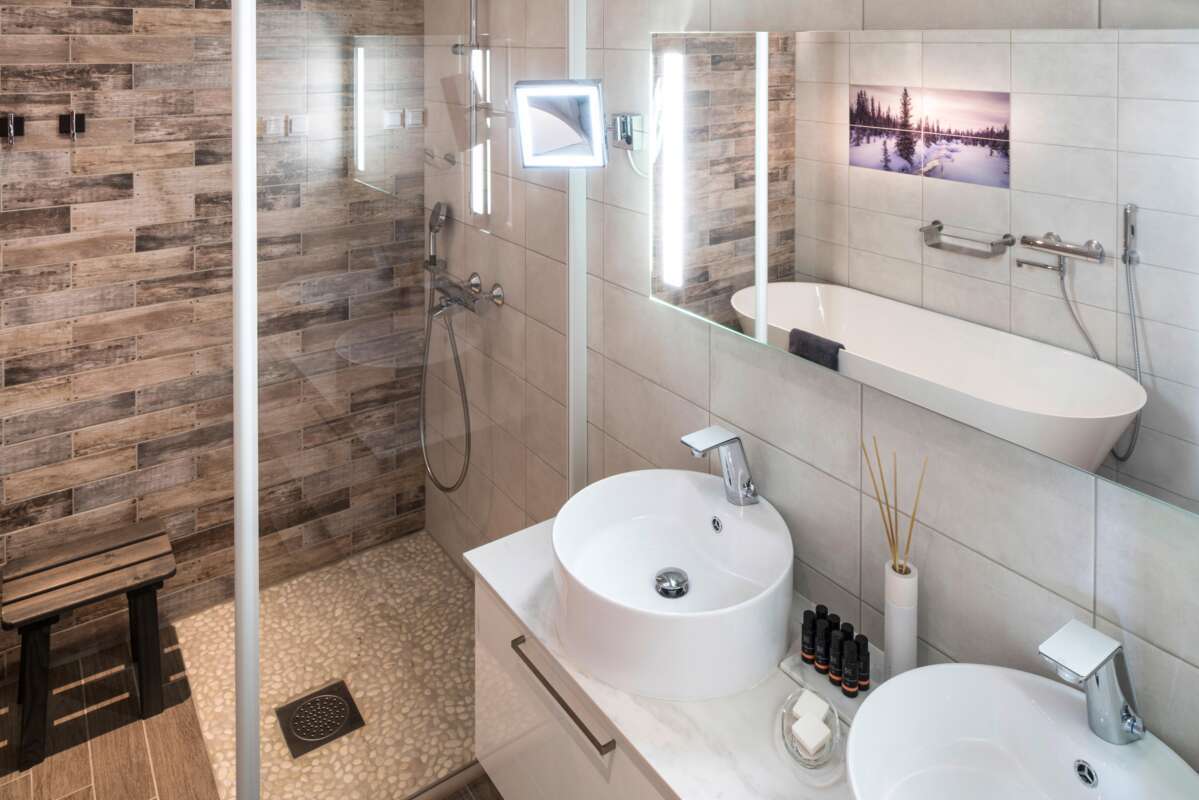 Il y a quatre chambres de cette catégorie et elles sont de même standard que les chambres supérieures, mais elle est plus spacieuse en termes de disposition et de superficie. À côté de la chambre séparée avec lit Kingsize se trouvent un salon avec une grande cheminée et une kitchenette. La spacieuse salle de bain dispose d'une douche et d'une baignoire. L'équipement et les détails techniques sont les mêmes qu'en chambre supérieure.