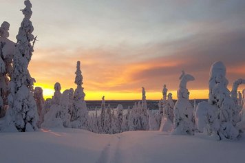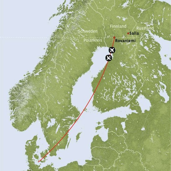 Vol direct pour Rovaniemi ou Kittilä et prise en charge de la voiture de location. Vous vous habituez vite à la conduite sur la neige grâce aux pneus cloutés. Après environ deux heures de trajet (resp. env. 3h15), vous atteignez Salla.