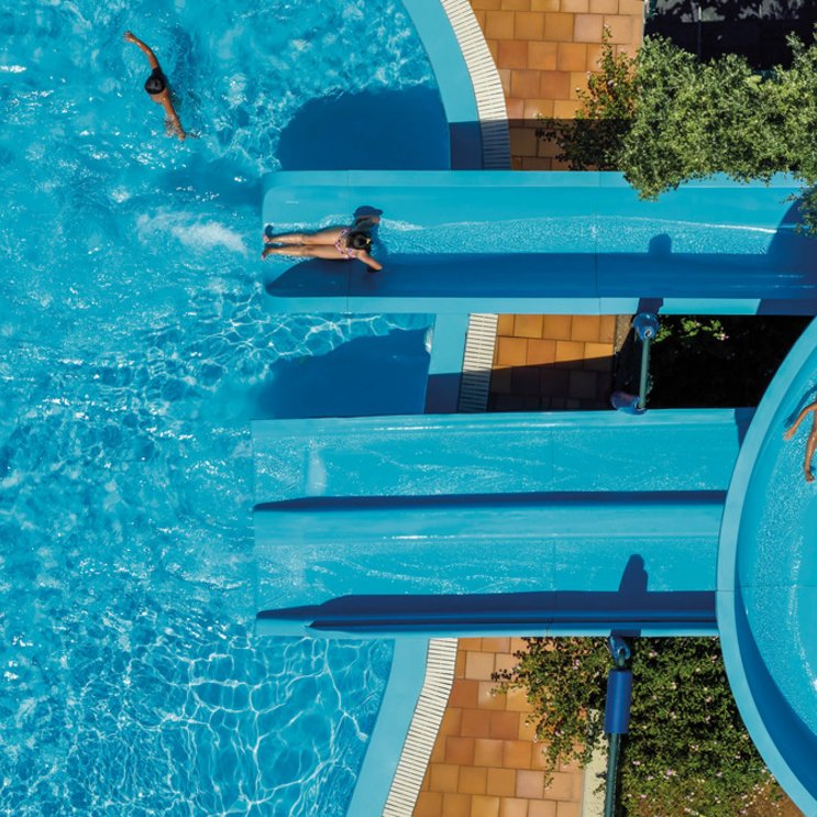 - 1 piscine : eau douce, toboggans aquatiques : 3 , parasols, transats, serviette de bain