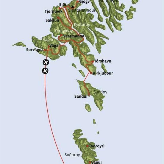 Nous prenons le bus et le guide à 12 h 30 à l’hôtel. Nous longeons le fjord et traversons la vallée jusqu’au village de Saksun. Nous faisons une promenade dans la région et visitons le musée Dúvugarðar. De Saksun, nous continuons vers un autre village magnifique, le village de Tjørnuvík avec sa plage de sable. Nous faisons une promenade dans le village et profitons de la nature. De Tjørnuvik, nous nous dirigeons vers le village le plus au nord de l’île d’Eysturoy, nous faisons un arrêt photo à la cascade de Fossá avant de traverser le pont sur l’océan Atlantique. Nous prenons un café et un gâteau en route. En route, un cadre plus beau et la nature nous attendent et nous passons le village og Eiði et aussi la plus haute montagne des îles Féroé, Slættaratindur, 882 mètres, et nous voyons également les impressionnantes formations rocheuses du Géant et de la Sorcière dans l’océan. A Gjógv, nous faisons une promenade dans le village et visiterons le port naturel ainsi que le belvédère des îles du Nord. A Gjógv, nous avons une soirée culturelle à Gjáargarður, dégustant de la nourriture locale et ayant l’occasion de participer à la danse locale des îles Féroé. Après le dîner à Gjógv, nous passons par le village de Funning où l’histoire raconte que le premier Viking est arrivé à terre et conduit le long du fjord jusqu’au village Strendur et prend le tunnel sous-marin pour retourner à Tórshavn.