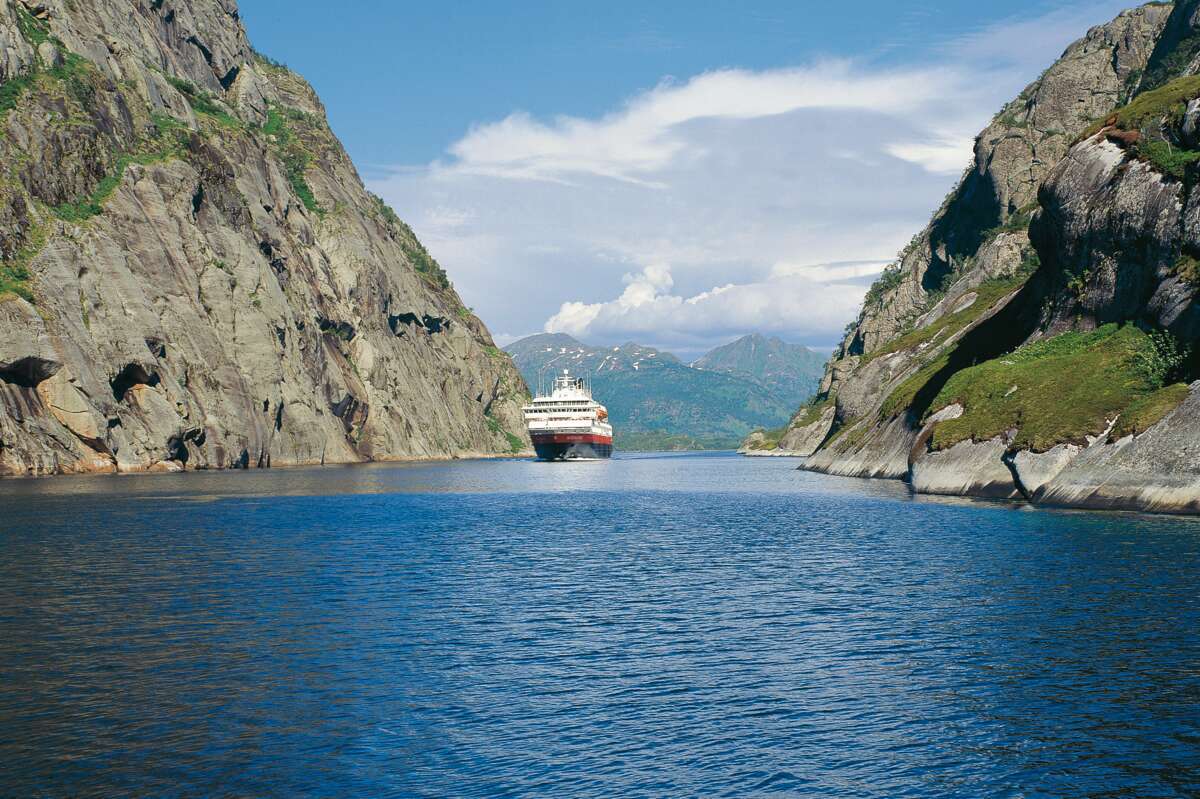 Cela vaut la peine de se lever tôt: vous longez la côte haute en couleurs et fertile du Helgeland et vous traversez le cercle polaire. Un paysage varié avec d'innombrables îles, montagnes et cascades se succède.