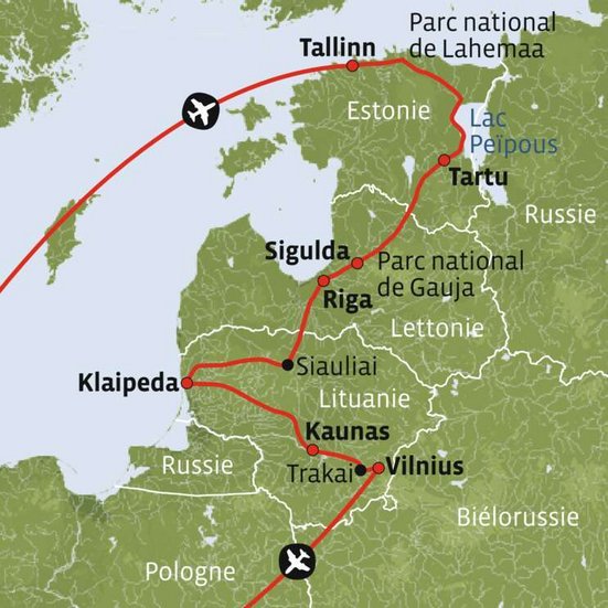 Vous roulez en direction de Cesis où vous vous baladez dans les petites ruelles et les magnifiques parcs. Vous atteignez ensuite le parc national de Gauja et la ville épiscopale de Sigulda. Finalement, trajet pour Riga où vous passez deux nuits.