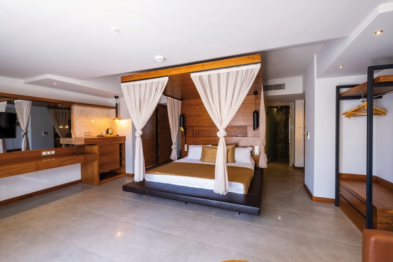 - 31-35 m², chambre double, douche, WC, chaussures de bain, sèche-cheveux, miroir cosmétique, sol stratifié, climatisation, commande centrale, minibar, remplissage quotidien, soft drinks, coffre-fort, TV (TV par satellite, écran plat), bouilloire, café/thé, balcon ou terrasse, jacuzzi, choix d’oreillers