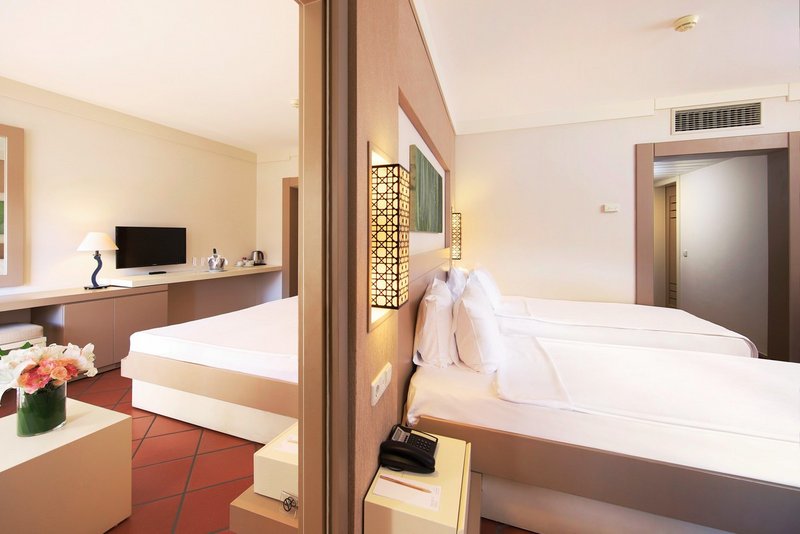 - 61-70 m², familles, avec porte communicante, côté jardin, Draps, serviettes et matelas 100% coton bio, 2 chambres à coucher séparées, 2 salles de bains, douche, WC, sèche-cheveux, miroir cosmétique, climatisation, minibar, coffre-fort, 2 TVs (TV par satellite), bouilloire, café/thé, balcon (meublé)