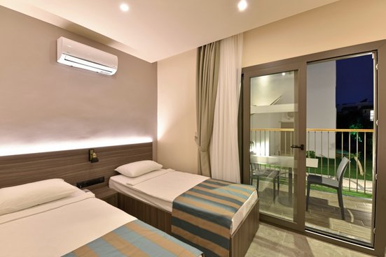 - 21-25 m², chambre double, lits double (1 lit double ou 2 lits simples), douche, WC, sèche-cheveux, carrelage, climatisation, réglage individuel, minibar, remplissage à l’arrivée, eau, coffre-fort (payant), TV (TV par satellite), balcon