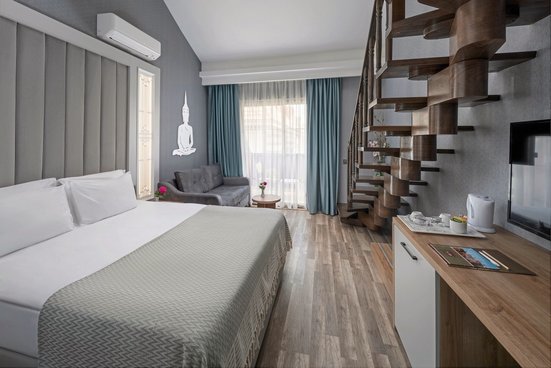- 41-45 m², familles, 2 étages, toit/toit incliné, canapé, 2 lits double (king-size), douche, WC, sèche-cheveux, sol stratifié, climatisation, minibar, remplissage quotidien, soft drinks, coffre-fort, 2 TVs, Wi-Fi, bouilloire, café/thé, terrasse