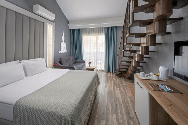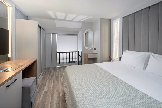 - 41-45 m², familles, 2 étages, étage, supérieur, vue sur la mer (latéral), 2 lits double (king-size), canapé-lit, 1 salle de bains, douche, WC, sèche-cheveux, sol stratifié, climatisation, minibar, remplissage quotidien, soft drinks, coffre-fort, 2 TVs, Wi-Fi, bouilloire, café/thé, terrasse