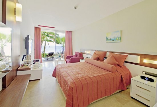 - chambre double, Deluxe, rez-de-chaussée, vue sur la mer, Draps, serviettes et matelas 100% coton bio, 1 salle de bain, douche, 1 WC, sèche-cheveux, carrelage, climatisation, réglage individuel, minibar, remplissage quotidien, soft drinks, bière, eau, coffre-fort, 1 TV (TV par satellite), Wi-Fi, bouilloire, café/thé, terrasse
