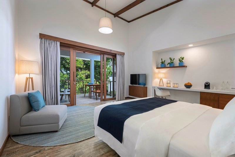 - 81-90 m², villa, situation de la plage, côté coucher du soleil, salon/chambre à coucher combinés, dressing, douche, baignoire, douche extérieure, WC, peignoir, sèche-cheveux, climatisation, ventilateur, minibar, remplissage quotidien, coffre-fort, TV, Wi-Fi, machine à espresso, café/thé, terrasse (meublé), accès direct à la plage