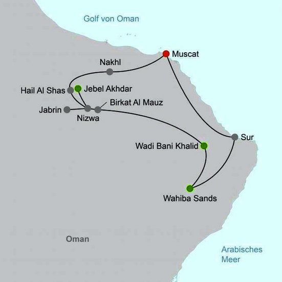 Vivez des aventures dans les décors de rêve d’Oman. Avec le véhicule tout-terrain, il traverse des montagnes et des gorges, de Mascate au Jebel Akhdar et dans le désert de Wahiba Sands.