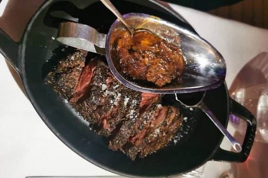En plus de nombreuses entrées délicieuses qui se prêtent à être partagées, le menu propose également une sélection de viandes de bœuf de première qualité, notamment du Black Angus, du Wagyu et même du bœuf de Kobe. Tout le monde ne commandera pas le steak Tomahawk à 540 USD ou le bœuf de Kobe à 420 USD, qui resteront probablement réservés aux véritables amateurs de viande. J’ai finalement opté pour le flank steak, après avoir longuement hésité entre le NYC Striploin, un ribeye steak et le filet mignon. Ces plats raffinés à base de viande peuvent tous être dégustés sans supplément.
