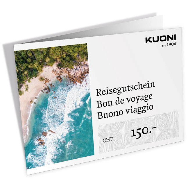 *La valeur minimale d’un bon est de 50 CHF. Le bon peut être utilisé dans toutes les agences Kuoni, Helvetic Tours et Rewi Reisen en Suisse. Le remboursement en espèces, l’échange ou l’utilisation ultérieure pour des voyages déjà réservés n’est pas possible.