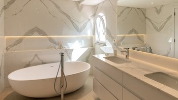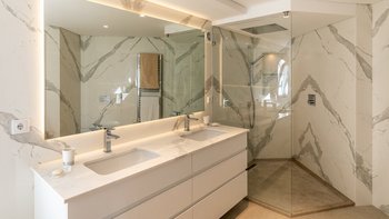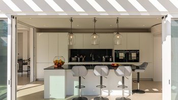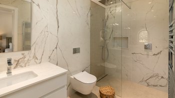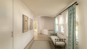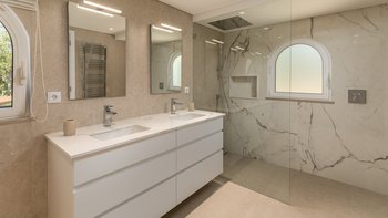Im Inneren führt die Eingangshalle zu einem geräumigen Wohnbereich, hell mit modernen Akzenten. Dieser Zimmer ist das Herzstück des Erdgeschosses mit französischen Türen, die direkten Zugang zum Außenbereich bieten. Auf dieser Etage befinden sich auch ein TV-Raum und ein Esszimmer, das zur Küche führt, ein elegantes und glorreiches, voll ausgestattetes Zimmer mit einer Inseleinheit und Zugang zum Sitzbereich im Freien, wo die Gäste in der Sonne frühstücken können. In Furhteron gibt es zwei Zweibett-Schlafzimmer, beide mit eigenem Bad und Türen zur Terrasse. Im Obergeschoss befinden sich weitere drei Schlafzimmer, zwei Doppel- und ein Zweibett-Schlafzimmer, alle mit eigenem Bad und Zugang zur Terrasse.
