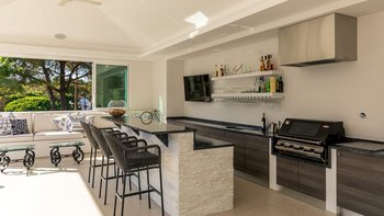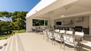 Draußen, auf einer erhöhten Terrasse, gibt es einen idyllischen Sitzbereich und einen Außenbereich mit einem Esstisch, einer Frühstücksbar und einem Bereich für die Zubereitung von Speisen mit einem Weinkühler, einem Kühlschrank für Getränke und einem Grill, ideal für Unterhaltung. Weiter unten einige Stufen finden die Gäste den Infinity-Pool und die umliegenden Gärten.
