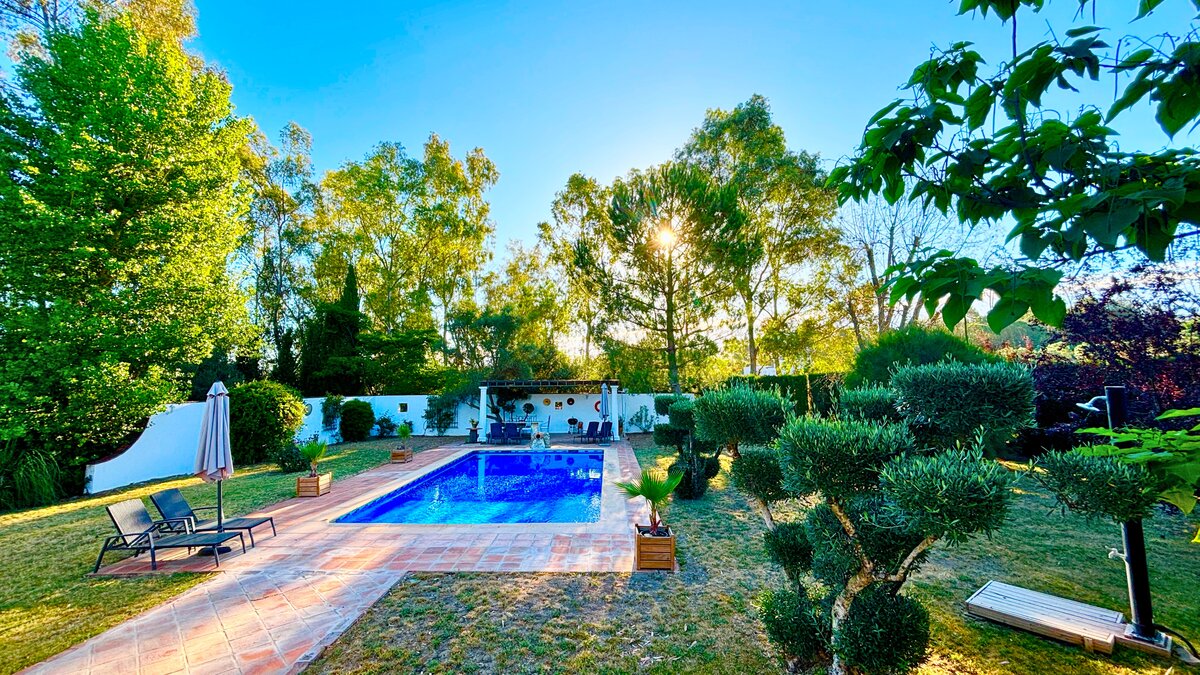 Gepflegte Rasenflächen und anmutige Bäume umgeben diese fröhliche Familienvilla, die ein natürliches Kissen der Privatsphäre bildet und einen einladenden 10-Meter-Pool umrahmt. An einem Ende bietet eine schöne Pergola am Pool einen schattigen Platz für lange und gemütliche Mahlzeiten im Freien. Ans andere Ende befindet sich die Villa selbst, die sich ein paar Stufen über dem Garten erhebt und sich zu einer zweiten Ess- oder Sonnenterrasse öffnet. Einfach eingerichtet, mit einem offenen Wohn-/Esszimmer und drei Schlafzimmern mit eigenem Bad, ist El Laurel sicherlich groß genug, um bequem eine Familie unterzubringen, aber seine intime und ungezwungene Atmosphäre macht es ebenso attraktiv wie ein Hideaway nur für zwei. Es teilt sich ein 3 Hektar großes Grundstück mit der kleineren Villa La Rondita und dem großen Finca la Alameda Haus, wenn es zusammen bestätigt wird. Wird es zusammen mit einem (oder beiden) von diesen gebucht, ist es eine gute Wahl für zwei Familien oder eine Gruppe von Freunden, die zusammen Urlaub machen, und der Kochservice könnte das Sahnehäubchen auf dem Kuchen sein. Ländlich, aber nicht abgelegen, ist die Villa nur 5 km von Ronda entfernt.
