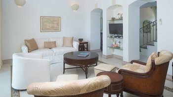 Im Inneren der Villa befindet sich ein offen geschnittener Wohn- und Essbereich im Erdgeschoss mit französischen Türen, die auf eine Terrasse, ein Tauchbecken und einen Garten führen. Denen beiden Schlafzimmer im ersten Stock verfügen jeweils über ein eigenes Bad und einen Balkon mit Garten- und Strandblick. Der Master-Suite erstreckt sich über die gesamte zweite Etage und verfügt über einen geräumigen Sitzbereich, ein eigenes Bad und einen Balkon mit herrlichem Meerblick. In der Küche können die Gäste ihre eigenen Mahlzeiten zubereiten, und für diejenigen, die lieber die lokalen Aromen ohne Hektik genießen möchten, kann der Küchenchef in der Villa jeden Tag zwei köstliche Mahlzeiten zubereiten, die auf Ihren persönlichen Vorlieben zugeschnitten sind.