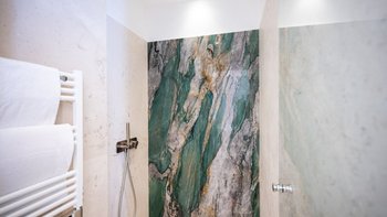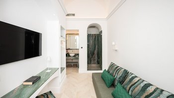 Auf der anderen Seite der Terrasse ist die Unterkunft geschickt in zwei separate Schlafzimmer-Suiten unterteilt, die Flexibilität und Privatsphäre bieten. Jedes Schlafzimmer verfügt über ein Super-Kingsize-Bett, Waschbecken im Zimmer, Fernseher und eine eigene Dusche, was die Aufteilung besonders für zwei Paare attraktiv macht, die zusammen reisen. Eine gemeinsame Garderobe mit WC und Bidet sorgt für zusätzlichen Komfort.