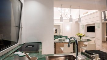 Der Hauptwohnraum befindet sich auf der oberen Ebene, die über Treppen von der Straße zu erreichen ist. Von hier aus mündet ein lichtdurchfluteter, offener Wohn- und Essbereich in eine kompakte, gut ausgestattete Küche, die für eine entspannte Selbstversorgung konzipiert ist. Große Türen führen direkt auf die Terrasse, wo großzügige Sitzgelegenheiten im Freien zu ausgedehnten Mittagessen und gemütlichen Abenden einladen, umrahmt vom allgegenwärtigen Meerblick.