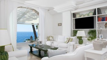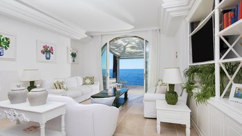 Im Inneren der Villa strahlt der offene Wohn- und Essbereich Eleganz aus und verfügt über einen komfortablen Sitzbereich mit drei stilvollen Sofas, die nahtlos in einen großen Esstisch übergehen, der sich perfekt für Geselligkeit eignet. Dessen offenes Design verstärkt das Gefühl von Raum und Licht und schafft eine einladende Atmosphäre, die sich ideal für Familienfeiern eignet. Große Fenster bieten einen nahtlosen Zugang zur Außenterrasse, auf der die Gäste im Freien speisen oder einfach nur in der mediterranen Brise entspannen können, während sie die atemberaubende Umgebung genießen. Deren gut ausgestattete Küche mit modernen Geräten ermöglicht eine mühelose Zubereitung von Mahlzeiten und ist direkt mit der Terrasse verbunden, um eine unkomplizierte Unterhaltung im Freien zu ermöglichen. Jeden Morgen wird den Gästen ein köstliches Frühstück mit frischem Gebäck, Obst der Saison und aromatischem Kaffee serviert. Jedes der sechs Schlafzimmer verfügt über ein eigenes Bad; drei im Obergeschoss bieten Zugang zu einer großzügigen Terrasse mit atemberaubendem Meerblick, während die beiden Schlafzimmer im Erdgeschoss auch Zugang zu einer Terrasse mit Meerblick haben.
