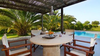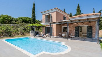 Mit jungen Palmen, die die Rasenflächen am Pool abschirmen, einem Grill und einer schattigen Terrasse für Mahlzeiten im Freien und wahrscheinlich der besten Aussicht auf das Privatanwesen von seiner erhöhten Lage auf einem steilen Hügel über dem Meer, ist diese luftige Villa ideal für einen Urlaub der Entspannung. Nur 450 Meter von der schönen Bucht in der Paliolinos-Bucht, ein Spaziergang bergab von der Unterkunft und zwei km von den Sandstränden und Dorftavernen von Spartia entfernt, spiegelt sich die ruhige ländliche Umgebung in einer angenehm ungezwungenen Einrichtung wider, die aufgeräumt ist, aber mit persönlichen Akzenten und Charaktereigenschaften aus lokalem Stein bestreut ist.
