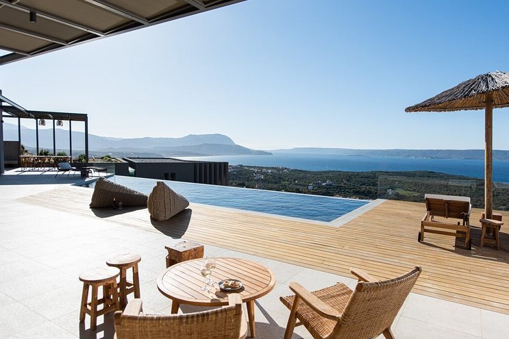 Die Villa Royal ist ein modernes Refugium in Hanglage mit herrlichem Meerblick und bietet eine ruhige Abgeschiedenheit und einfachen Zugang zu den Stränden und der zerklüfteten Küste im Westen Kretas.
