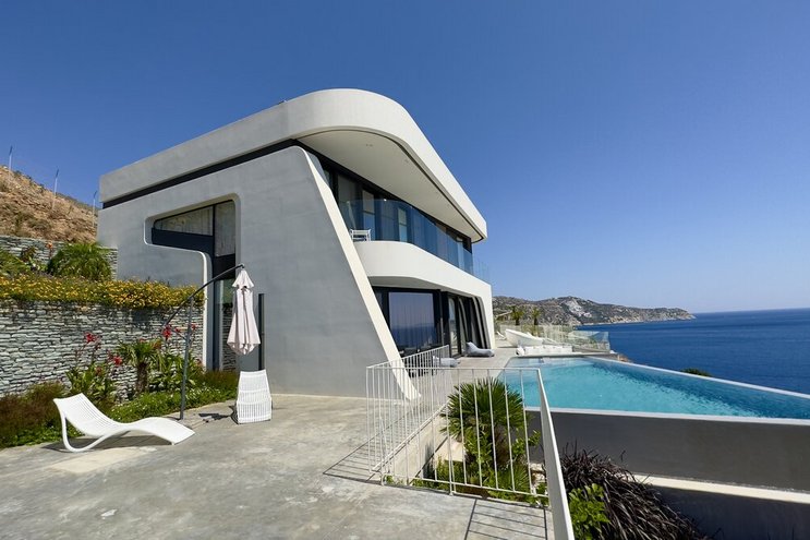 Stilvolles Design bringt kosmopolitischen Chic auf die Landschaft in dieser Luxusvilla mit zwei Pools, einem Fitnessraum und einem Weinkeller. Weit offener Blick auf das Meer und die Berge trägt zur inneren Gelassenheit bei.