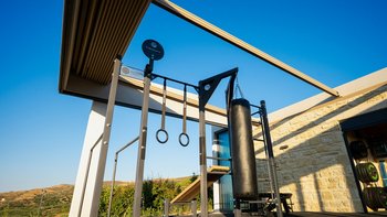Im Obergeschoss befindet sich das Hauptschlafzimmer mit freistehender Badewanne, eigenem Duschbad und eigenem Balkon mit Panoramablick. Zwei weitere Schlafzimmer mit eigenem Bad – eines davon ist von außen zugänglich – bieten Flexibilität und Privatsphäre für Gruppen von bis zu sechs Personen.
