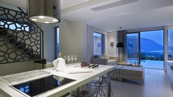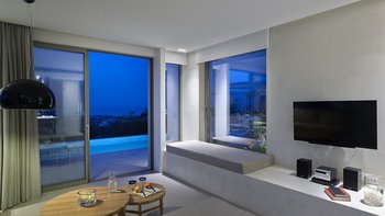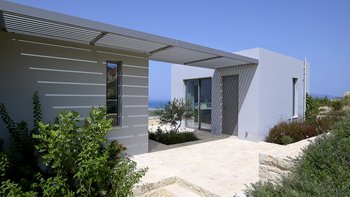 Das Erdgeschoss verfügt über einen hellen, offenen Wohnbereich mit einer voll ausgestatteten Küche und raumhohen Fenstern, die den Raum mit Licht durchfluten und auf eine geräumige Terrasse mit Meerblick führen. Im Freien können die Gäste unter einer schattigen Pergola im Freien speisen oder sich am privaten Infinity-Pool entspannen, der in glattem Cimentogonia gehalten ist und so gestaltet ist, als würde er mit dem Meer verschmelzen.