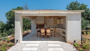 Jedes der sechs Schlafzimmer mit eigenem Bad öffnet sich entweder auf einen Balkon oder eine Terrasse, wodurch die erhöhte Lage und das natürliche Licht der Villa optimal genutzt werden. Deren Aufteilung ist ideal für Familien oder Gruppen, mit vier Doppelzimmern, darunter eine Master-Suite mit Kingsize-Bett, und zwei Zweibettzimmern. Eine offene, voll ausgestattete Küchenzeile geht in den Essbereich im Freien über und lädt die Gäste ein, entspannte Mahlzeiten im Freien zu genießen, die mit Leichtigkeit zubereitet werden.