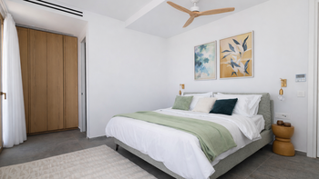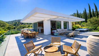 Der Hauptwohnbereich ist offen und elegant zurückhaltend, wo ein großzügiger Wohnbereich nahtlos in eine moderne Küche und einen Essbereich mit Frühstückstheke übergeht. Große Türen öffnen sich auf weitläufige Terrassen, die einen Whirlpool und eine Mischung aus sonnenverwöhnten und schattigen Sitzbereichen für entspanntes Leben im Freien offenbaren. Ein Kochbereich im Freien ist perfekt für lange, entspannte Abendessen bei Sonnenuntergang eingerichtet. Ein Lesebereich befindet sich versteckt in einer privaten Gartenecke und bietet einen ruhigeren Ort für Momente der Ruhe.