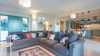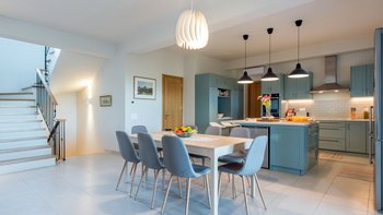 Im Erdgeschoss dieser charmanten, gelb gestrichenen Villa befindet sich eine große OFFENER GRUNDRISS Küche, ein Ess- und Wohnzimmer. Deren Küche ist komplett ausgestattet mit modernen Armaturen und einer Inseleinheit mit Frühstückstheke, ideal für die Gäste, um Kontakte zu knüpfen, während sie essen oder trinken. In der Nähe befindet sich der Ess- und Wohnzimmerbereich mit viel Tageslicht und französischen Türen, die Zugang zum Außenbereich bieten. Dieser Raum ist ideal für ein nahtloses Leben im Innen- und Außenbereich. Deren Erdgeschoss verfügt auch über einen Fitnessraum mit Heimtrainer und Hanteln und ein Zweibettschlafzimmer mit Dusche en suite, beide mit Türen, die zum Pool- und Gartenbereich führen.