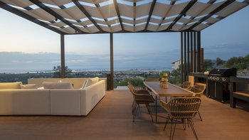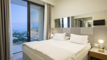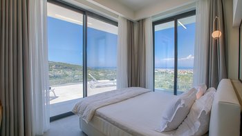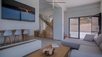 Calliope ist schick und modern, in angenehmen neutralen Farbtönen mit markanten Marmorböden eingerichtet und zu einem sehr hohen Standard mit sehr bequemen Betten eingerichtet. Dessen offener Grundriss Wohnbereich ist hell und luftig, mit einem großen Ecksofa und einem Flatscreen-TV; Die gut ausgestattete Küche hat auch eine Frühstückstheke mit Sitzgelegenheiten zum geselligen Kochen und Essen. Es gibt drei schöne Schlafzimmer, die alle en suite sind – das Schlafzimmer im Erdgeschoss öffnet sich zur Terrasse und beide Schlafzimmer im Obergeschoss haben Zugang zu einem Balkon mit Aussicht.