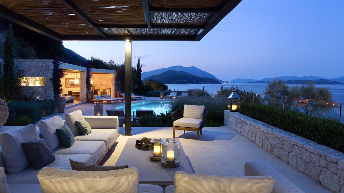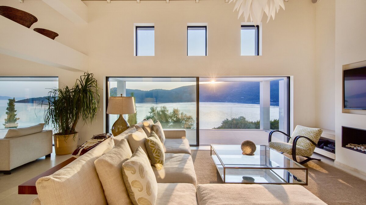 Das Herzstück des Hauses ist ein spektakuläres, doppelhohes, offen geschnittenes Wohnzimmer und eine Küche, die sich im Obergeschoss befindet. Bodenhohe Glasfenster an zwei Seiten rahmen einen ungestörten Blick auf Meganissi, Thilia, die Skorpion-Insel und Lefkada ein und durchfluten den Raum mit Licht. Deren elegante, voll ausgestattete Küche verfügt über eine Arbeitsplatte aus weißem Corian und eine große Kücheninsel mit Barbestuhlung, ideal für zwanglose Mahlzeiten und Getränke am Abend. Von hier aus öffnen sich die Türen auf eine Veranda, die nahtlos mit der Poolterrasse verbunden ist und ein entspanntes Leben im Innen- und Außenbereich ermöglicht.
