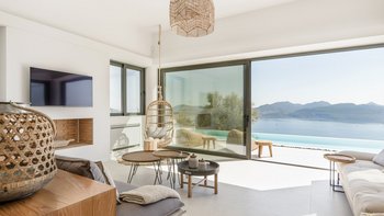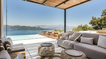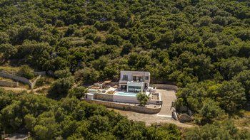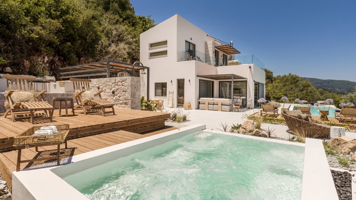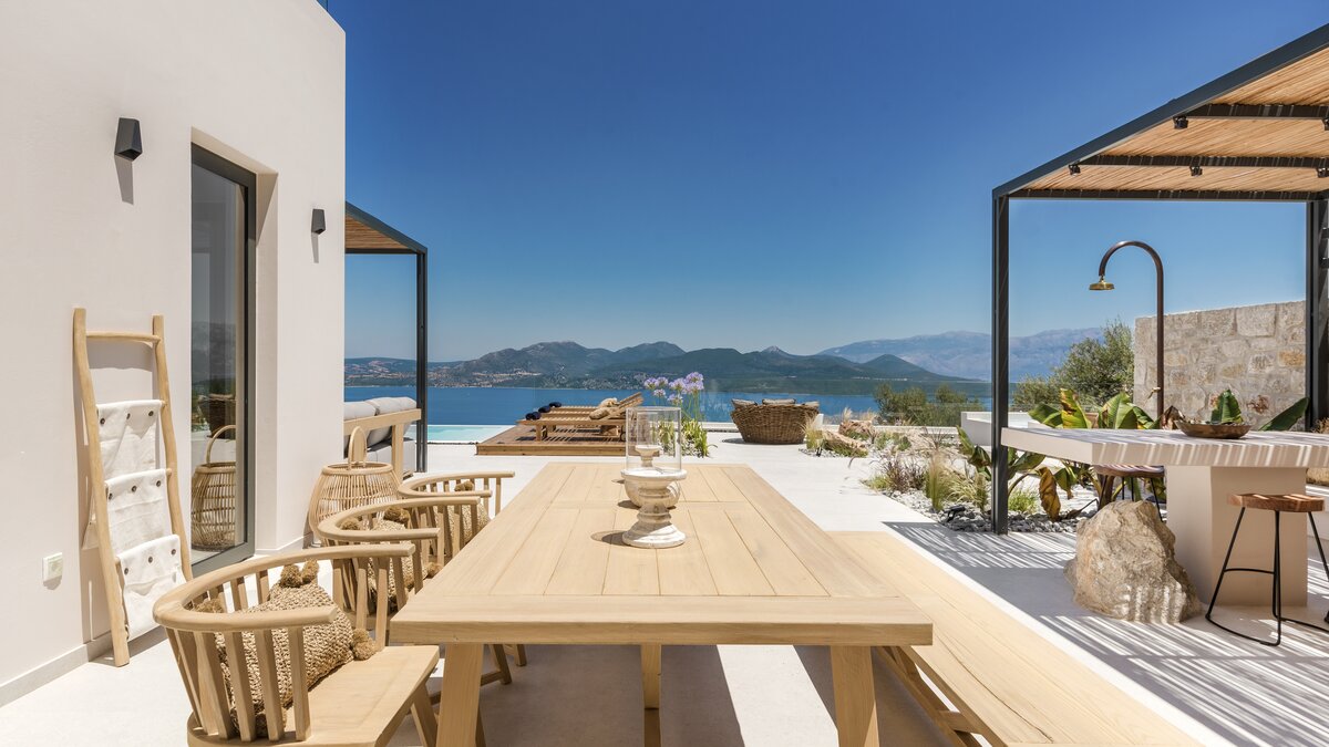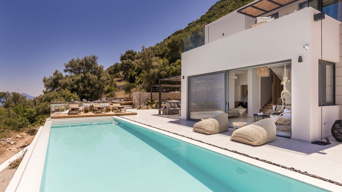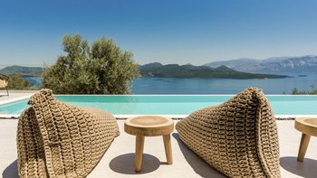 Perched atop a lush hill in Nikiana, Villa Agapi offers breathtaking panoramic views over the Ionian Sea and nearby islands, blending modern comfort with natural elegance for the perfect Lefkadian escape.